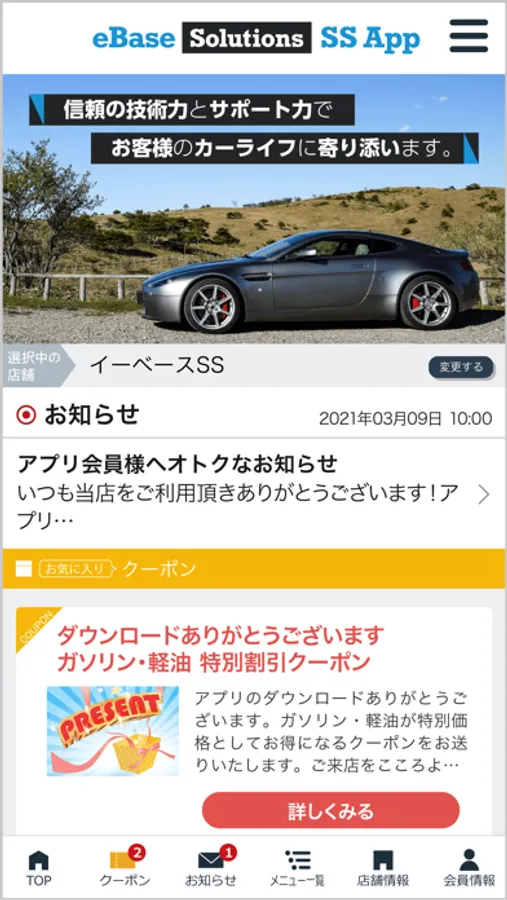 当社の公式アプリ「イーベース・ソリューションズ SSアプリ」ではアプリで簡単に予約が可能のほか、当店で利用いただけるお得なクーポンや各種メニューの割引情報を配信しております。