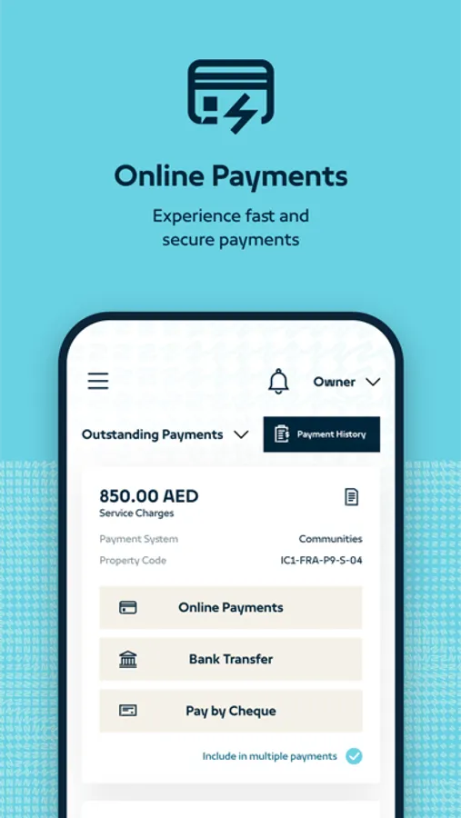 Save your credit card for easy payment of service charges and rent instalments, or view your payment history.