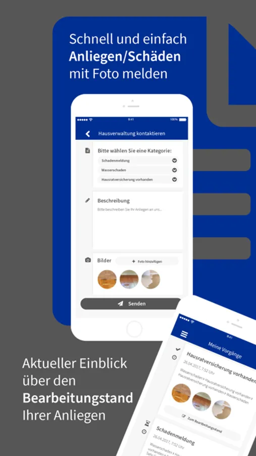 Als Mieter oder Eigentümer können Sie Schäden oder Anliegen direkt mit Fotos über unsere App melden. Ihre Anfragen stehen unseren Mitarbeiten dann zur Verfügung und können auch an Handwerksbetriebe weitergeleitet werden.