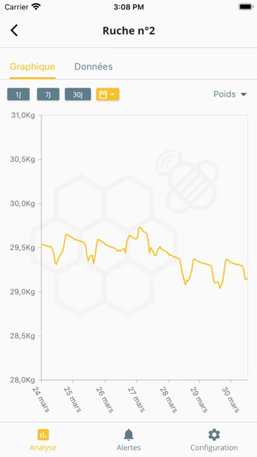 Visualize the evolution curve of the weight and temperature of your beehives.