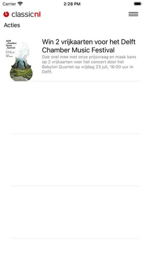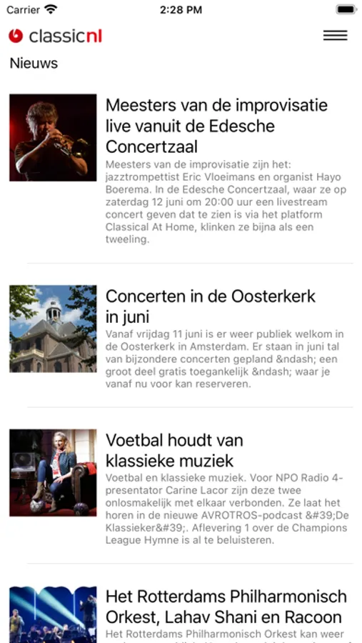 Sfeerverhogend, maar niet bepalend, rustgevend, toegankelijk en inspirerend. De mooiste symfonieën, weergaloze orkesten en ensembles, de beste solisten, de grootste meesterwerken, je hoort ze allemaal in een toegankelijke variatie van verschillende periodes, stijlen en uitvoeringen. Luister ook naar onze themakanalen, zoals Classicnl Premium: reclamevrij genieten!