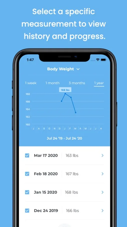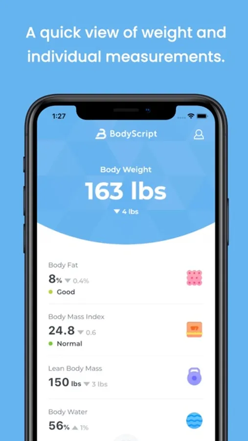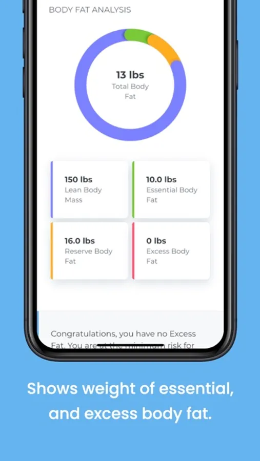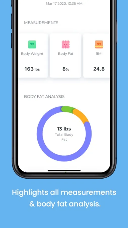 Review your personal dashboard with a quick view of body weight, vitals and individual measurements. Body fat analysis shows the weight of your three body fat types: essential, reserve, and excess body fat. History and individual progress are available for each measurement.