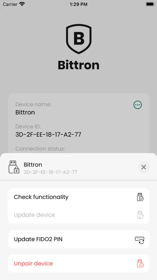 Bittron is complemented by the user's mobile app. The app authenticates the user's login - the user must confirm the login via Bittron by entering a PIN or biometric data (fingerprint). If the user moves away from the connected device (leaves the desk), Bittron automatically disconnects the connected session. ProID Bittron is a state-of-the-art solution for secure work identity and login to computers and systems.