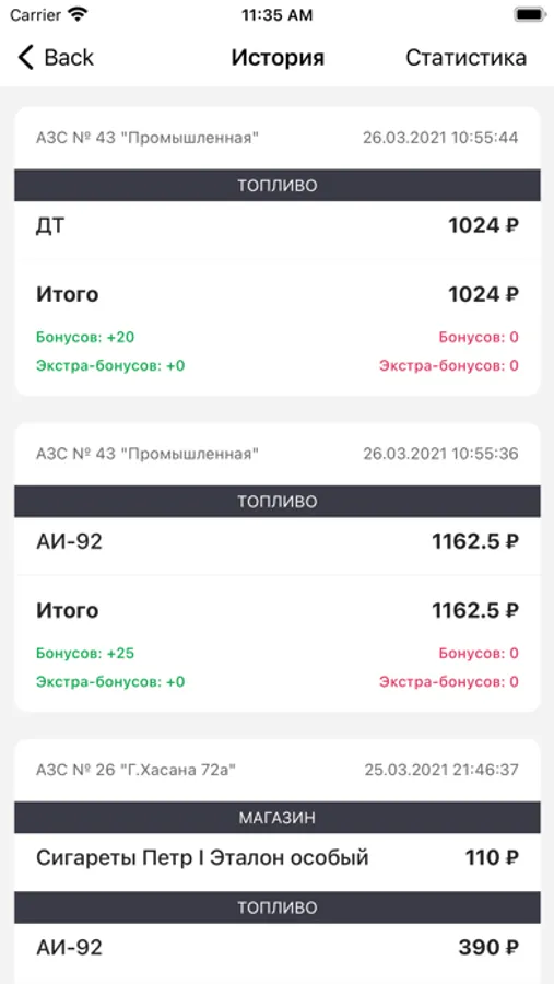 - следить за состоянием вашего бонусного счета и видеть всю историю покупок на АЗС;