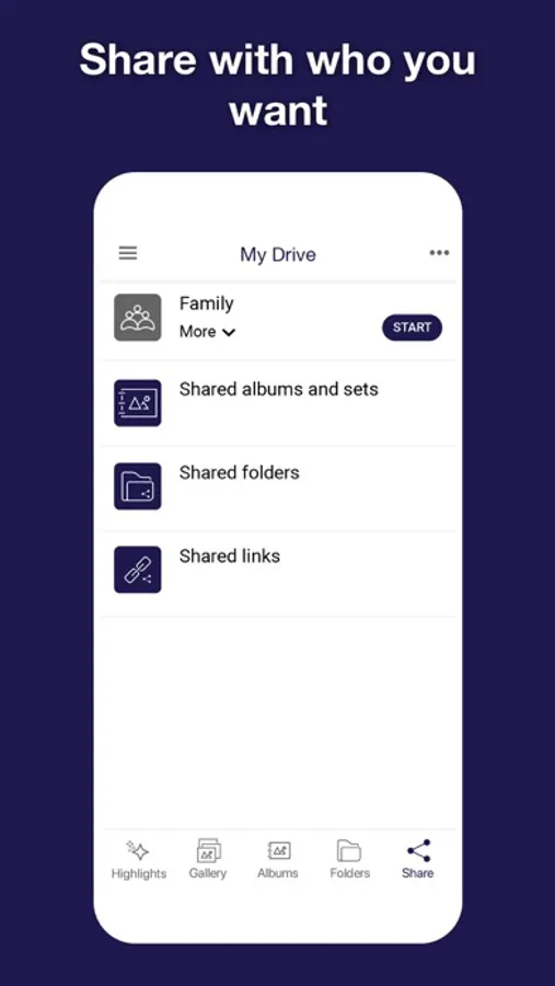 • Set up a Family and instantly share cloud pictures, videos or documents with family members.