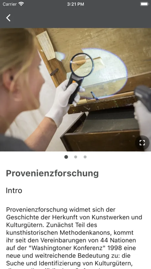 Die App ermöglicht den Besuch der Ausstellung von zu Hause aus, alle zehn Kapitel werden mit umfangreichem Begleitmaterial präsentiert. (Fast) alle Objekte der Ausstellung werden gezeigt und – nur hier – mit zahlreichen weiteren Dokumenten, Audiobeiträgen und Filmen näher erläutert. Jedes Kapitel enthält zudem eine kleine Präsentation, in der eine der Kuratorinnen einzelne Objekte noch einmal persönlich vorstellt. Durch die zahlreichen weiterführenden Hinweise (Broschüren, Internetseiten usw.) bietet die App einen ersten umfassenden Einblick in die Provenienzforschung, in die Arbeit von einschlägigen Institutionen, aber auch zu allgemeinen Zusammenhängen.