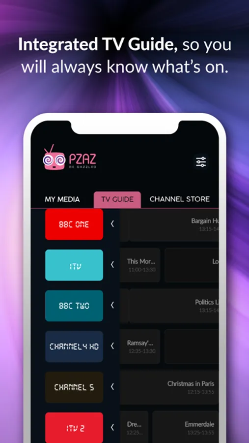 Pzaz works on anything, anywhere, anytime. Just download the Pzaz app on your iPhone or iPad, sit back and relax. PZAZ makes it super easy to indulge in great television.