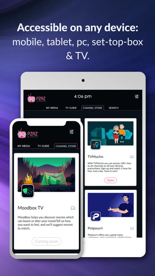 Discover binge-worthy TV - films, shows, series, sports and more - in the Pzaz Channel Store, add them to your channel lineup and indulge in great TV, on anything, anywhere, anytime.