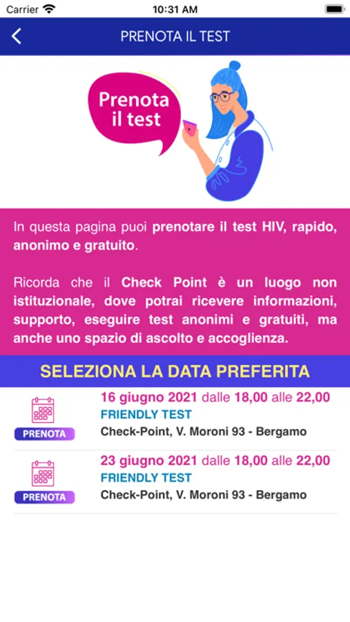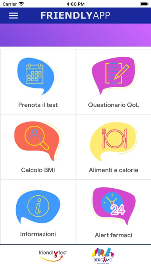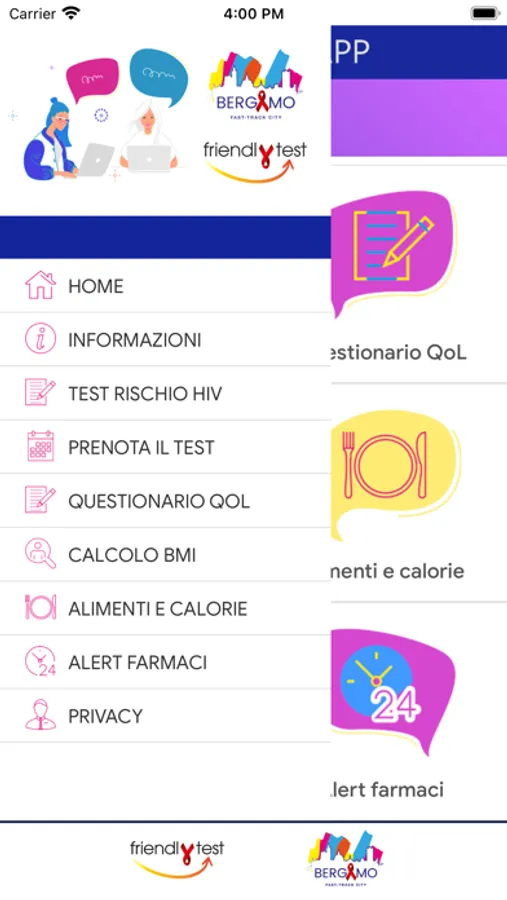 La App è stata realizzata appositamente per la rete di Bergamo Fast-Track City a supporto del progetto Friendly Test che, a partire da un sito informativo ed educativo www.friendlytest.it, punta ad offrire l’opportunità di sottoporsi al test rapido, anonimo e gratuito presso il Check Point cittadino, una realtà non istituzionale dove poter eseguire non solo il test per HIV ma, abitualmente, anche quello per HCV e sifilide.