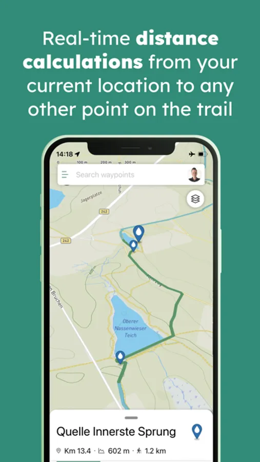 - Real-time calculations show the exact distance between your own location and any other place along the trail.