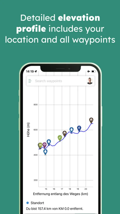 - Elevation profile shows your current location alongside all waypoints so you know how much climbing or descending is ahead.