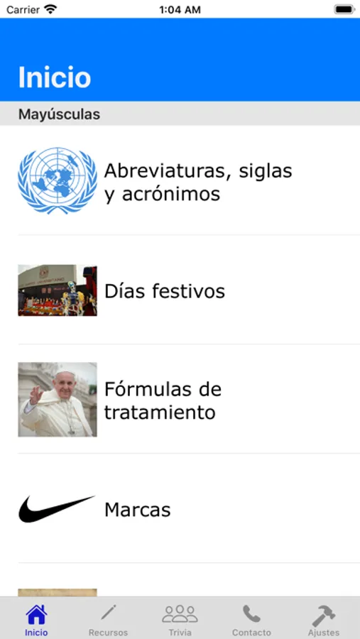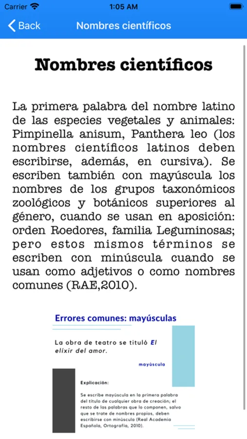 Aplicación para aprender y reforzar los temas que abarca el uso de mayúsculas. La aplicación cuenta con una sección de reglas, una sección de ejemplos y una sección de práctica.