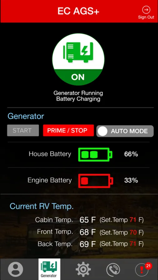 The Energy Command Auto Gen Start (AGS+) allows you to remotely monitor and manage your RV generator and set up automatic generator starting, all from your mobile device. With an easy-to-use and friendly mobile interface, it sends notifications and gives you access to your generator. Note: This app requires an EC-AGS+ device installed in your RV to work. Among the features included: