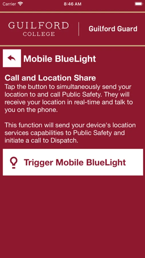 - Mobile Bluelight: Send your location to Guilford College security in real-time in case of a crisis