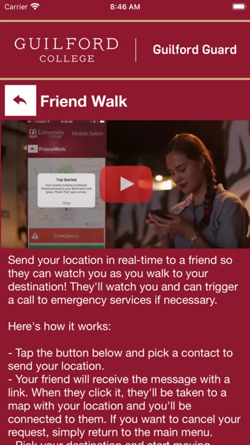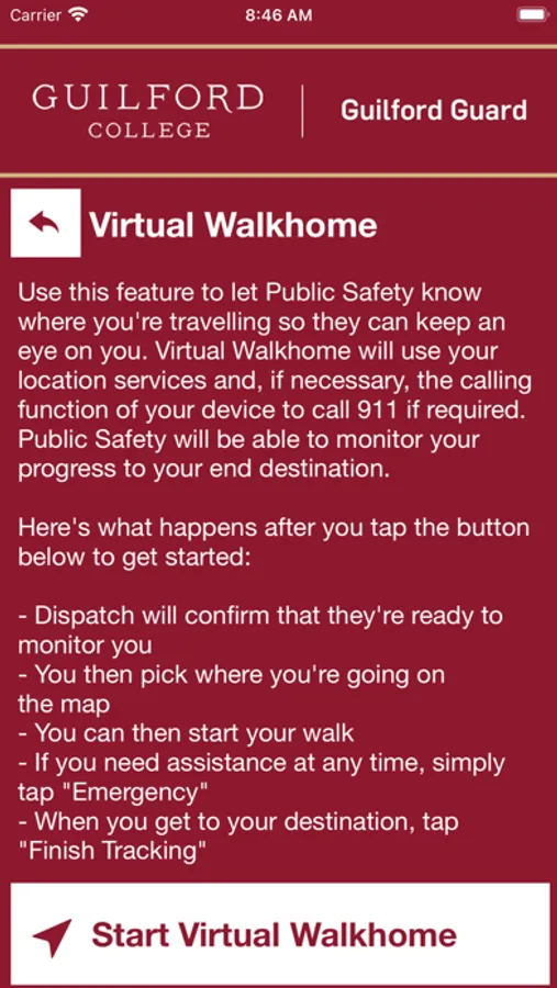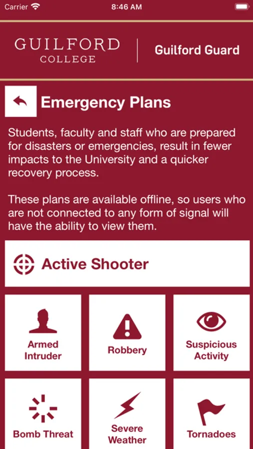 - Safety Notifications: Receive instant notifications and instructions from Guilford College safety when on-campus emergencies occur.