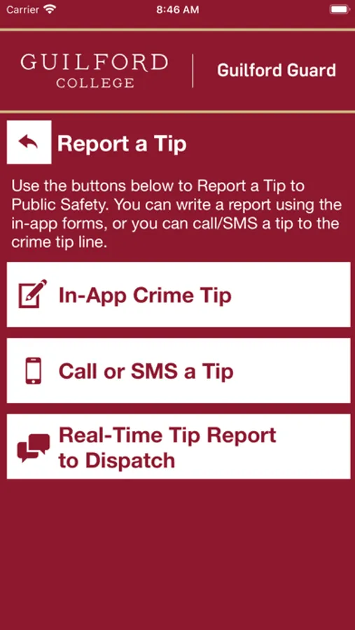 - Tip Reporting: Multiple ways to report a safety concern directly to Guilford College Public Safety.