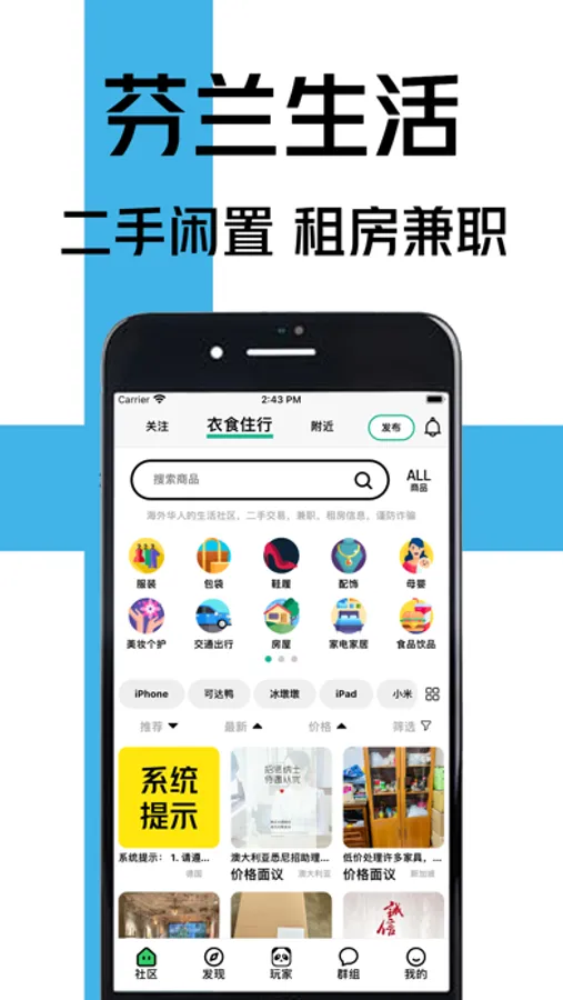 芬兰华人的生活社区,用户发布二手商品,生活服务,家政保姆,上门维修,民宿租房,兼职招聘等生活信息。
