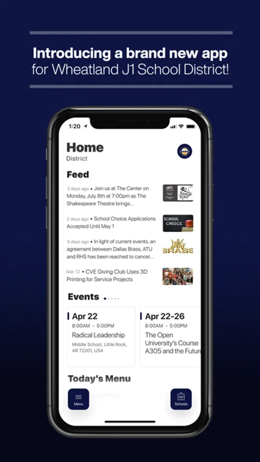 The event section shows a list of events throughout the district. Users can add an event to your calendar to share the event with friends and family with one tap.