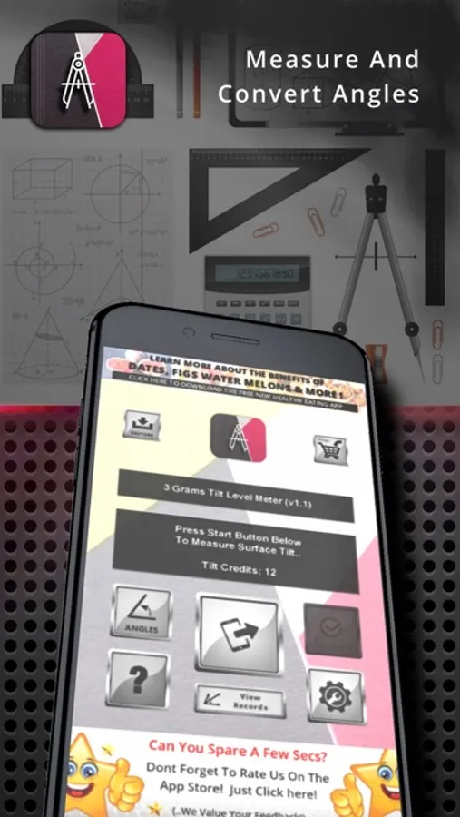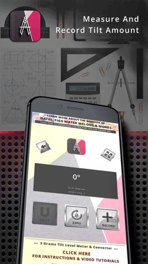 3 Grams Tilt level Meter is a free app that allows you to measure the tilt of a flat surface such as a shelf, in a similar way to a level meter. The tilt value is shown in degrees and when its a zero it means the phone and the surface it is on is straight horizontally. It measures from 0 to 90 degrees.