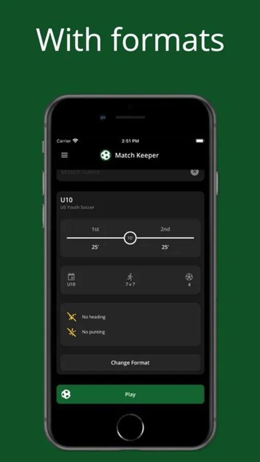 • View format restrictions: No heading, No offside, No goalie, or No punting