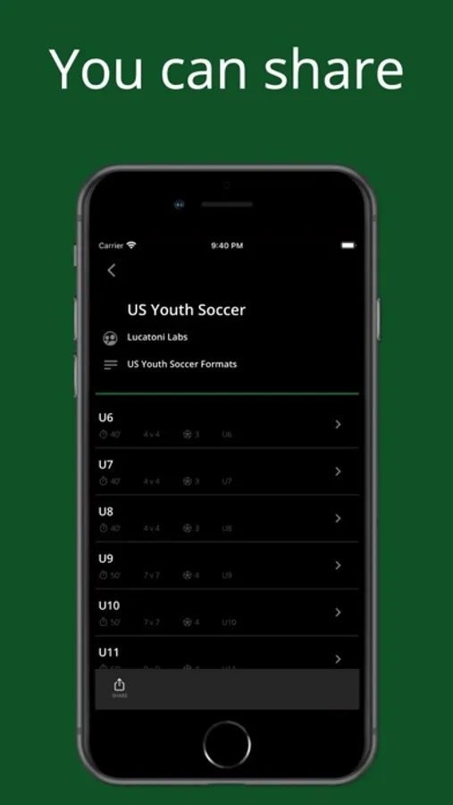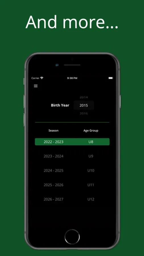 • View current match format: age group, number of players, ball size, and field/goal dimensions
