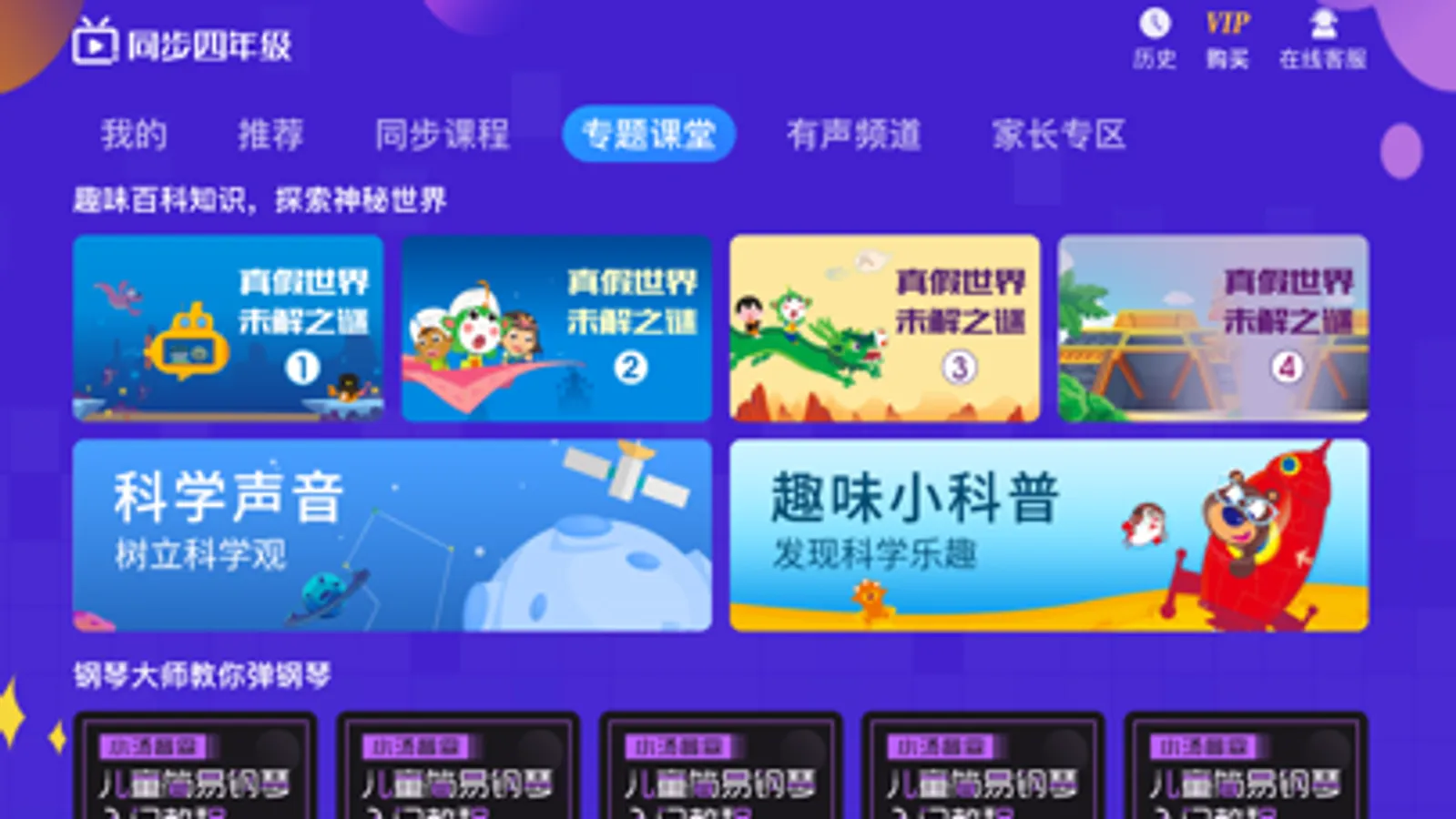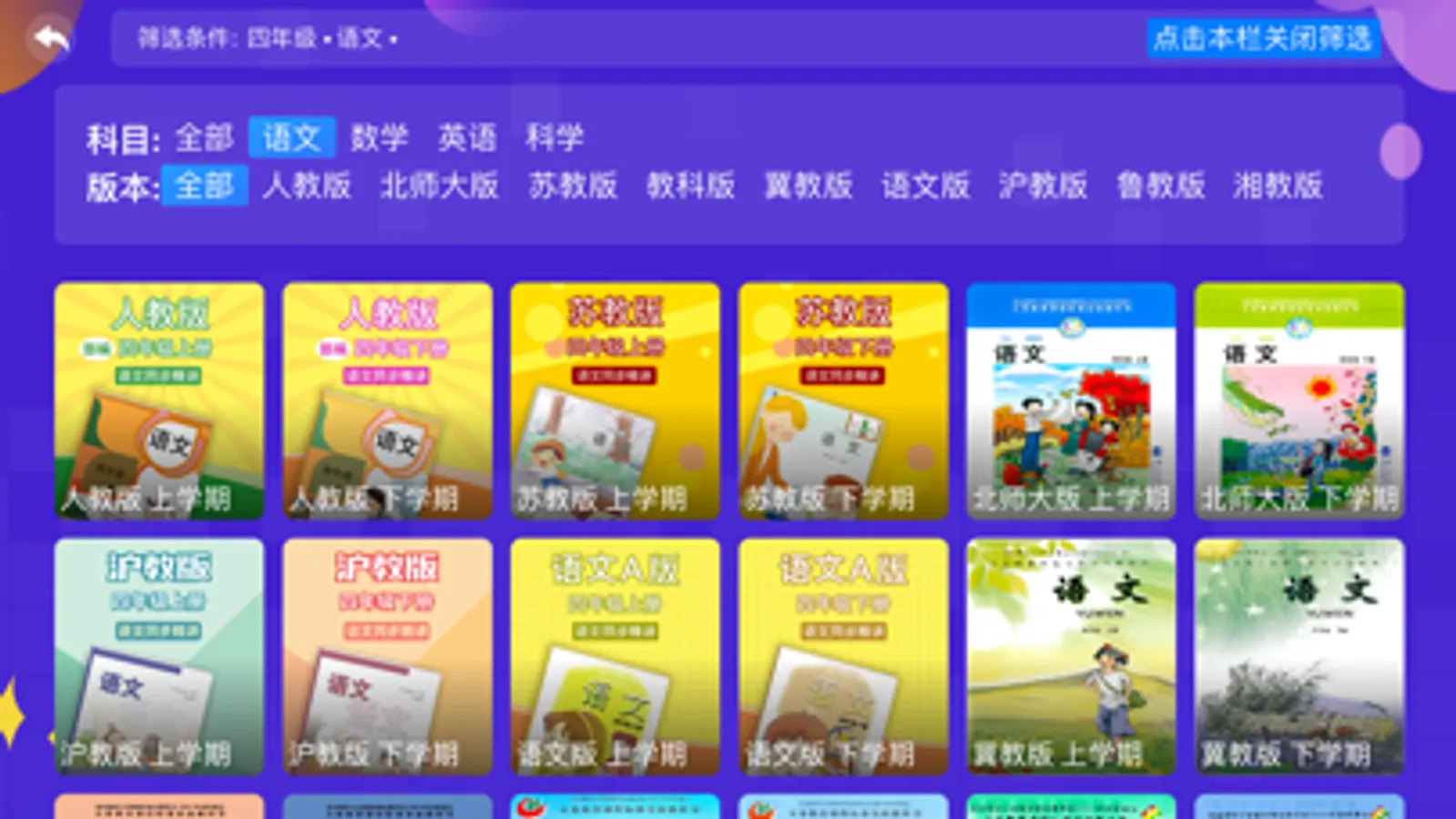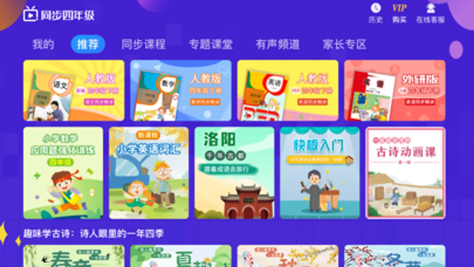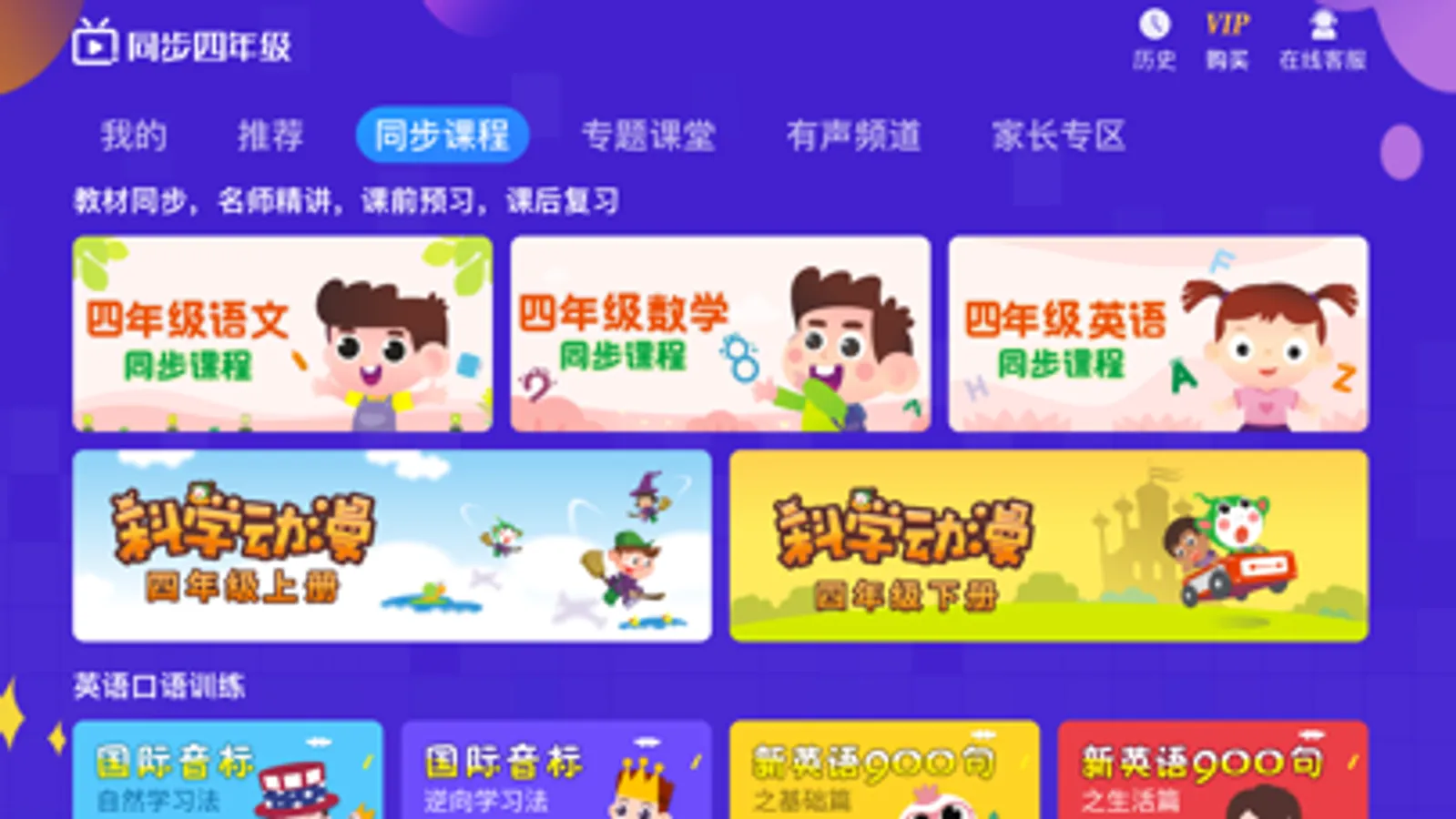 小学四年级同步课堂:语文、数学、英语、科学上下册跟教材完全同步的辅导课程。