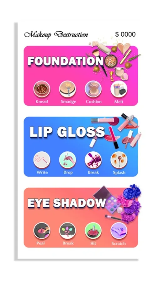Tons of makeup sets to destroy from including makeup eye shadow palette, red lipstick show, liquid concealers, lash lift mascara, destroying eye liner art, eye shadows, foundations, creams, bronzers, lip liners, lip glosses and so much more using your fingers with amazing animations that will give you an oddly satisfying ASMR tingling sensation in your brain.
