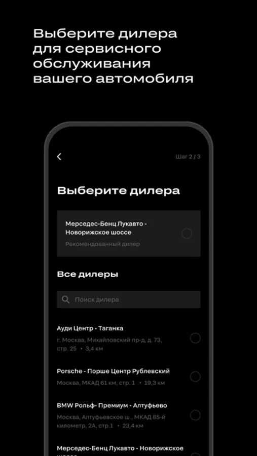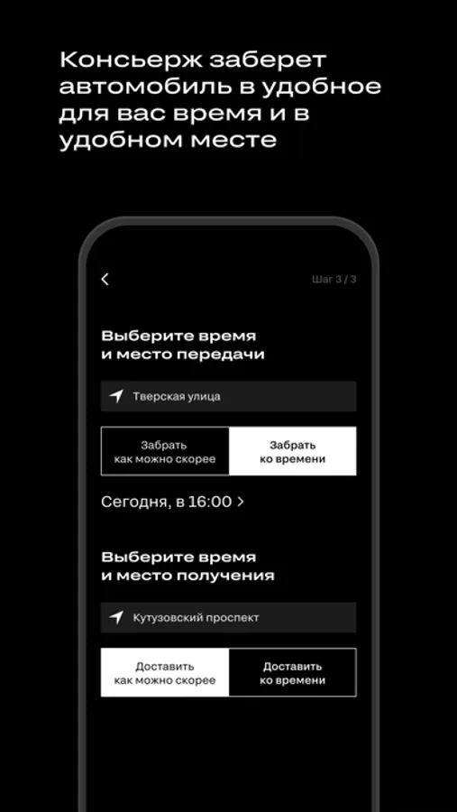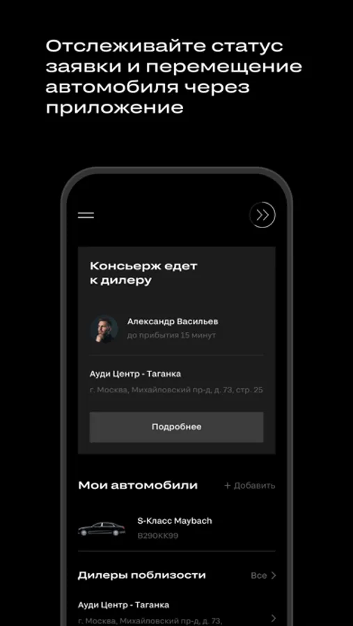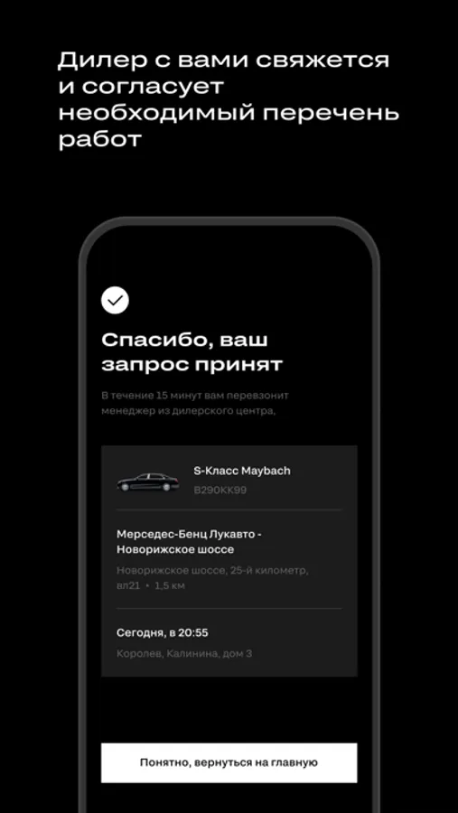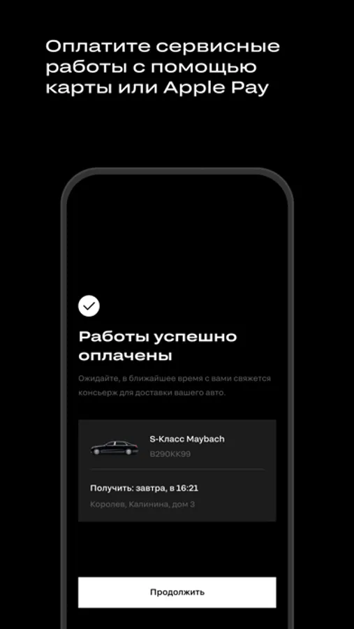 Выберите дилера и время для сервисного обслуживания Вашего автомобиля. Дилер лично свяжется с Вами и согласует необходимый перечень работ. Наш консьерж заберет Ваш автомобиль в удобное для Вас время и в удобном месте. Вы сможете постоянно отслеживать местонахождение Вашего автомобиля. А по окончанию сервисных работ Вы сможете оплатить услуги дилера с помощью карты, Apple pay или Google pay. После чего мы вернем Ваш автомобиль в удобное для Вас время и место.