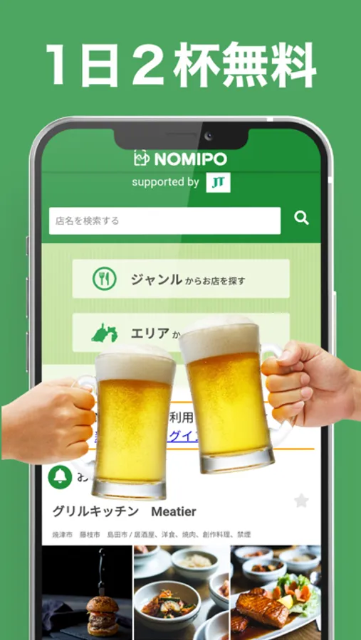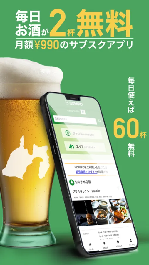 NOMIPOは定額で、毎日お酒が2杯無料で飲めちゃうサービスです!