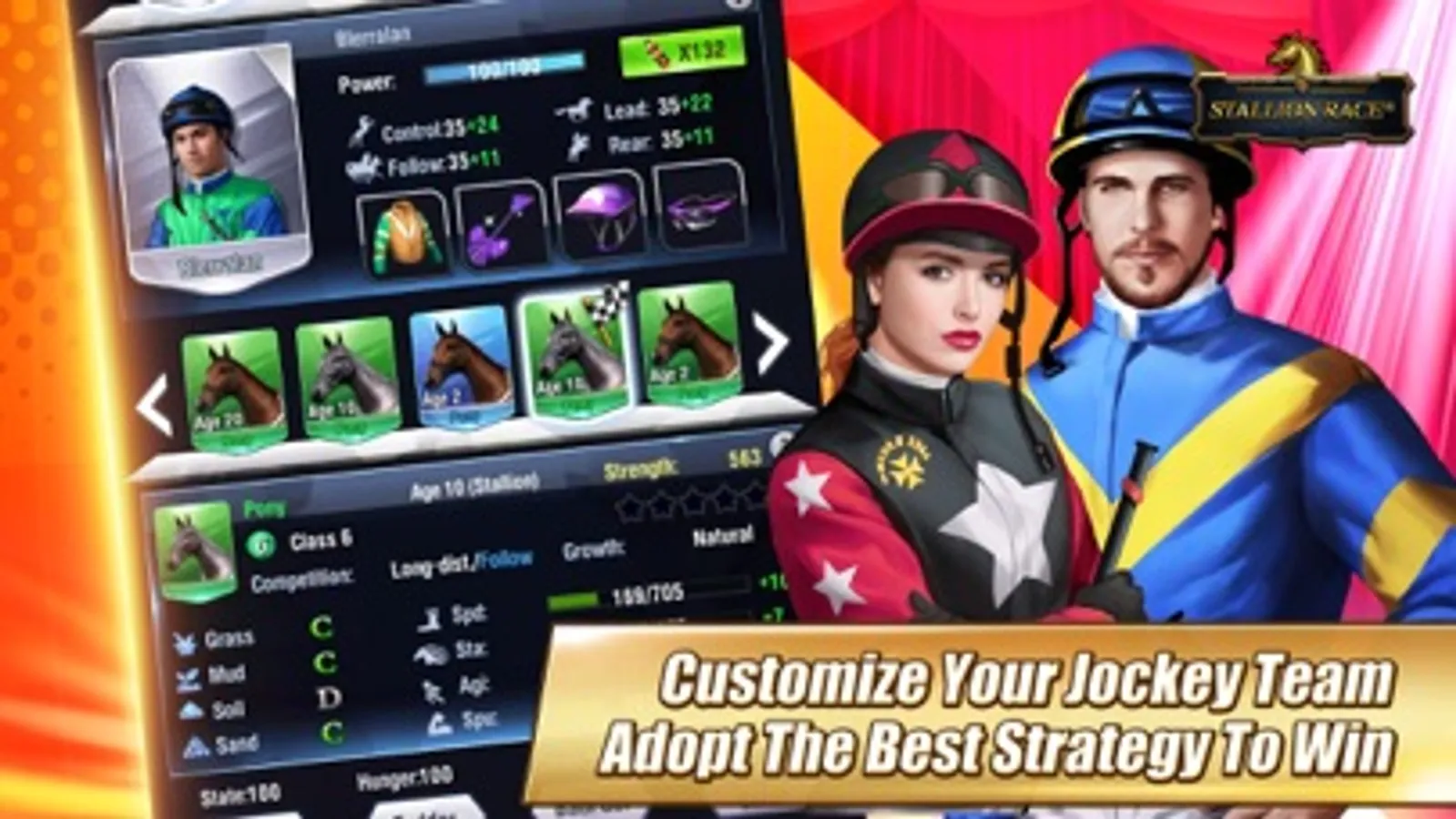 It is important to choose a brilliant jockey and improve their equestrian skills with customized training. A great jockey will improve the performance of the horse. Upgrade and optimize your jockey team to increase their performance during races. Remember to dress up your jockeys and choose the best equipment for a photo finish. Adjust your horse racing strategy, set your racing tactics according to your horse's ability and choose lead, forestall, balance, follow or pursue as the horsepower distribution. Become a horse racing tycoon and experience the real passion of equestrian competition.