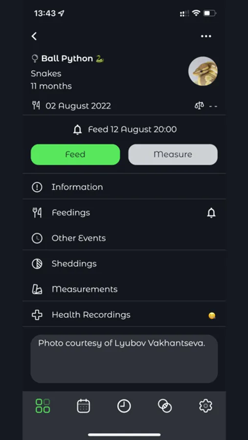 With Reptile Rocket you can track sheddings and the growth process. Add animal measurements and photos to see how your reptile pet has changed over time.