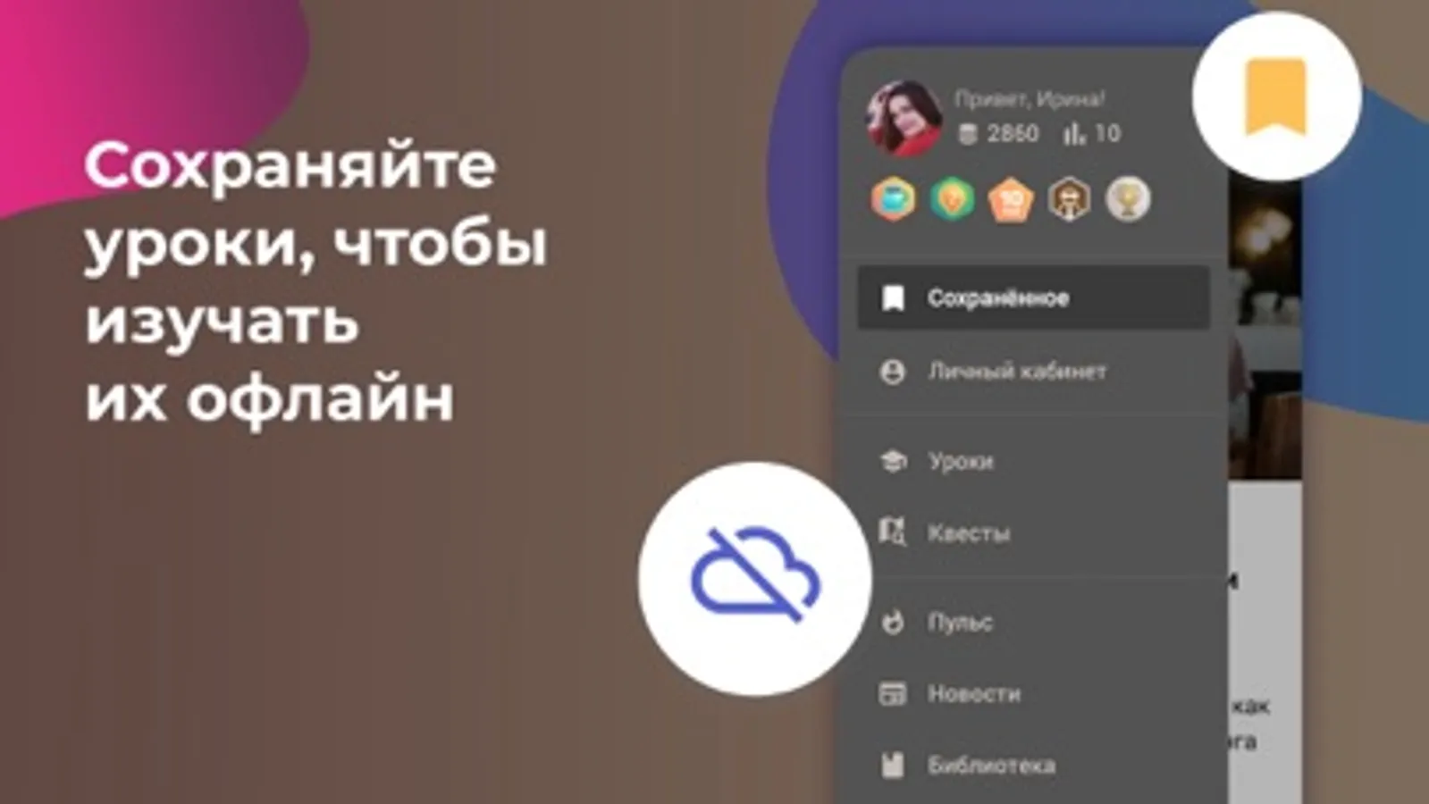 Чтобы изучать уроки без подключения к интернету, загружайте уроки на свой смартфон с помощью кнопки «Сохранить».
