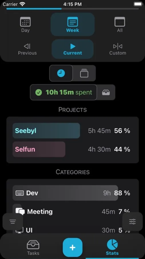 • Consult the statistics of the distribution of the number of tasks or the time spent by project and by category.