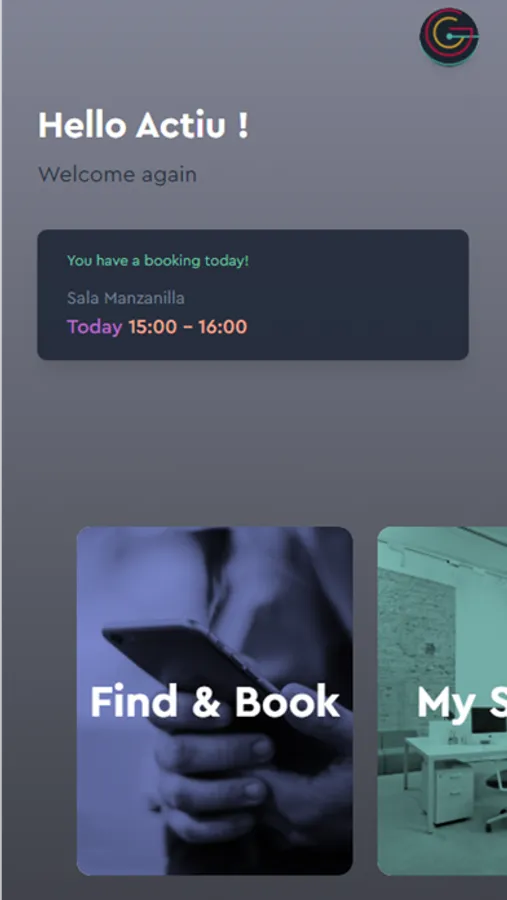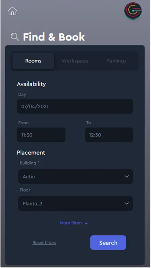 Find & Book: Reserva puestos específicos o salas a través de la aplicación. Selecciona el edificio, la planta, la capacidad y el tipo de equipamiento informático que necesites y te mostrará los lugares disponibles. Para las plazas de aparcamiento podrás seleccionar un edificio e indicar el tipo de vehículo (moto, coche, coche eléctrico) indicando tu matrícula, la App te asignará un número de plaza.