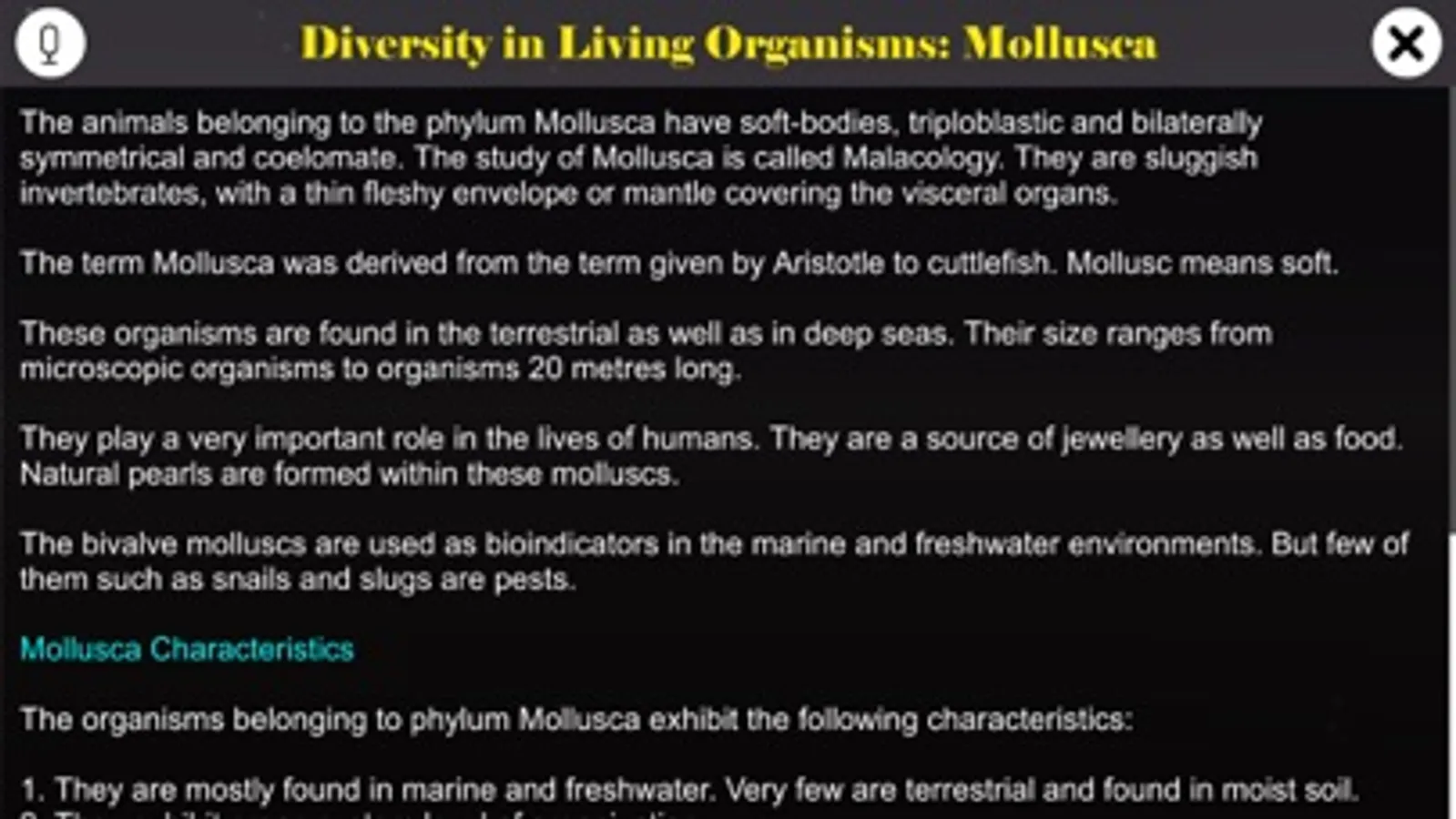 - Tap and Pinch Zoom - zoom into and identify about Diversity of living: Mollusca.