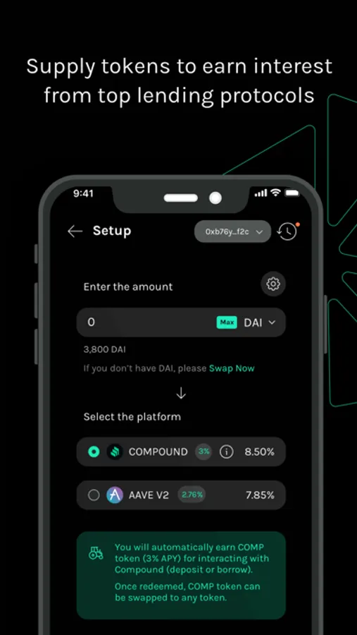 - Krystal queries our integrated lending platforms (Aave, Compound etc.) and presents you a list of interest rates.