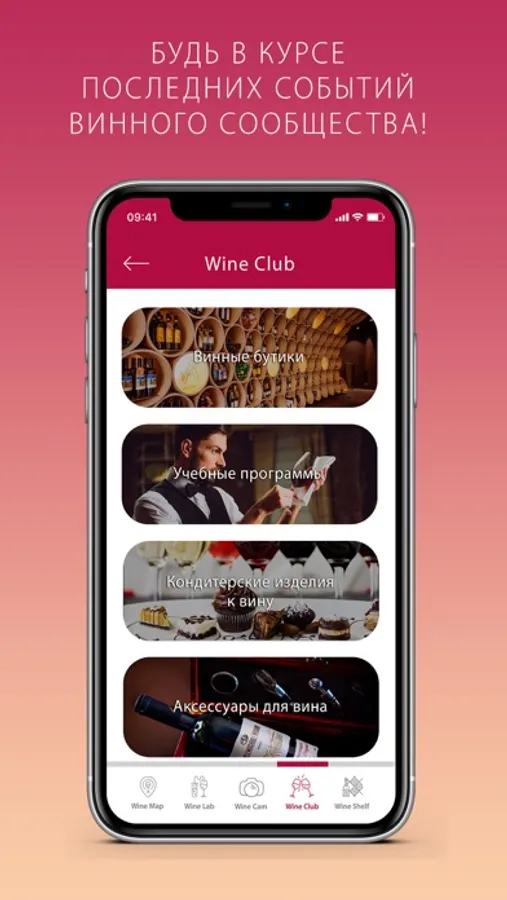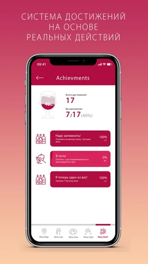 * Полезные материалы и система достижений. Откройте мир лучших напитков. Возможность ставить оценку винам и сохранять винодельни, которые уже посетили. Учебные программы для ценителей вина.