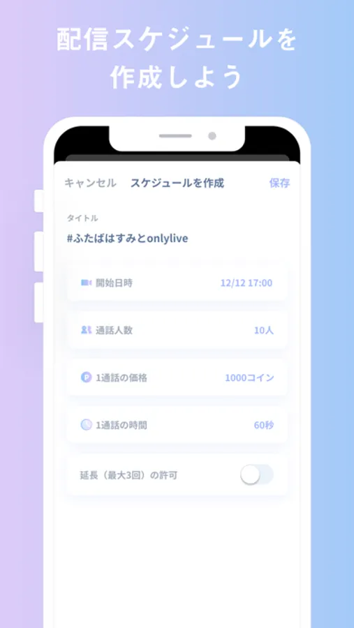 onlyliveは、会場の手配や安全対策といった準備は必要ありません。いつでもどこでも簡単にファンミーティングを開催できます。日程・参加上限人数・通話分数・価格など自由に設定できるため、空いた時間でファンを楽しませることが可能です。