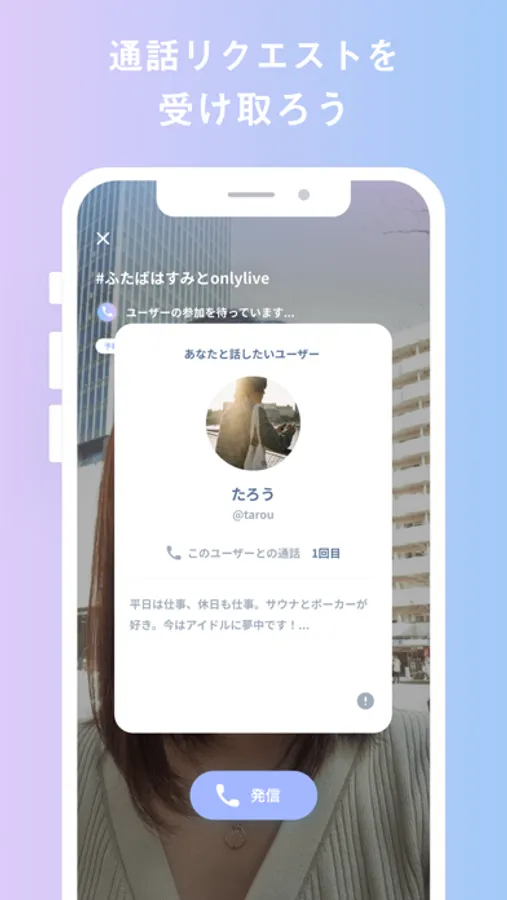1対1のライブ通話の様子は、音声なしの状態で第三者に表示することも可能。これにより会話の様子がオープンになり、開放性のあるファンミーティングの開催ができます。