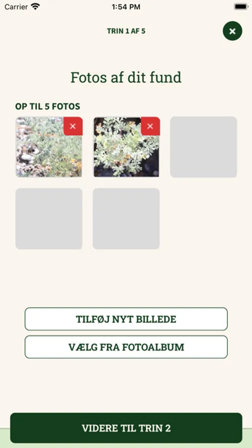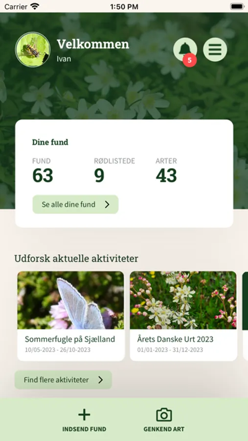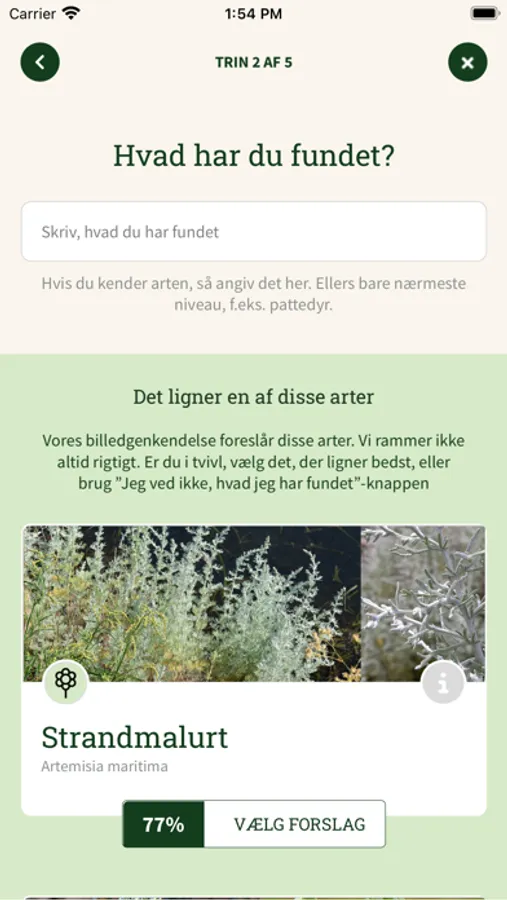 Hvis du vælger ”Indsend nyt fund” på forsiden i appen, vil du blive ledt gennem 5 trin til at indberette er fund. Hvis du er i et område uden internetforbindelse, vil fundet automatisk blive indberettet til arter.dk, når du atter har forbindelse. Det kræver dog, at du downloader offlinekort under indstillingerne øverst til højre på forsiden, inden du begiver dig ud i naturen.