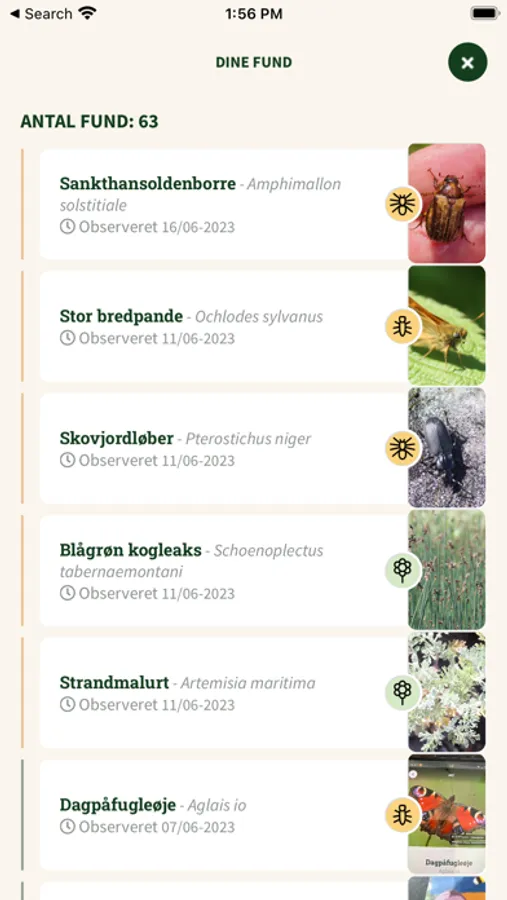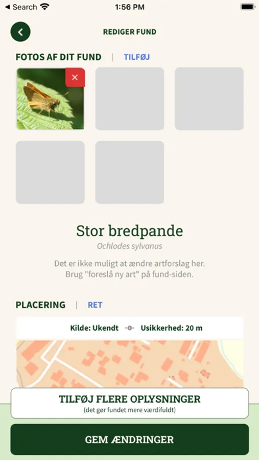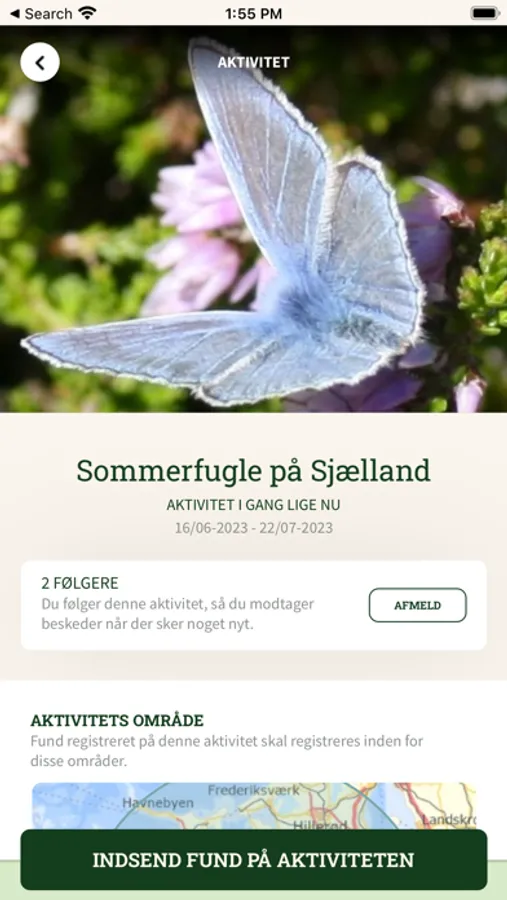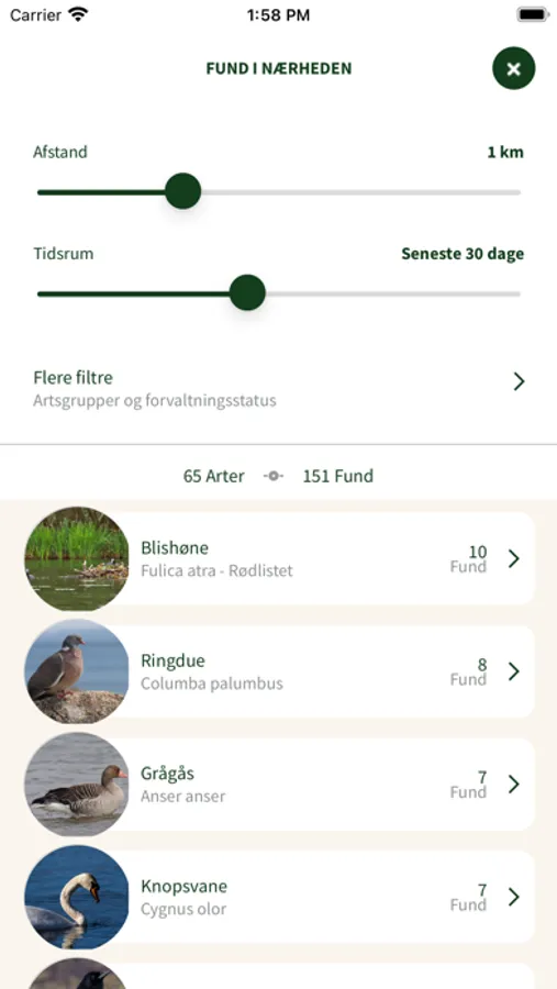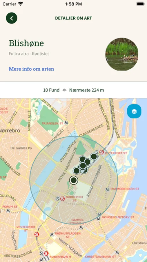 På forsiden kan du også vælge at ”se fund i nærheden”. Her kan du se, hvilke fund der er gjort inden for nogle definerede afstande og tidsrum, eksempelvis inden for 1 kilometers afstand de seneste 30 dage. De enkelte resultater indeholder link til Artsbogen på arter.dk. Hvis du skal bruge et mere detaljeret billede af forekomsterne, skal du også ind på arter.dk, da appen kun er en helt simpel app til at tage med ud i naturen.