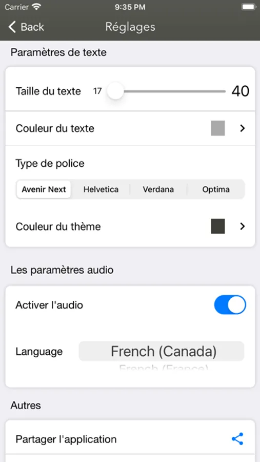 Inclut les paramètres de taille de police, ainsi que l'audio pour tous les chapitres de la Bible (