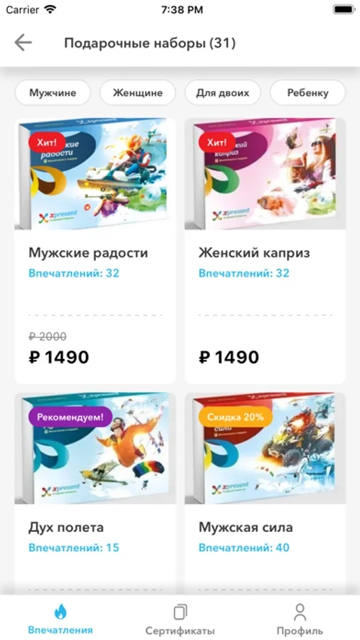 Подарочные наборы включают в себя от 11 до 68 впечатлений. Получатель подарка сам выберет ту услугу, которая ему понравится.