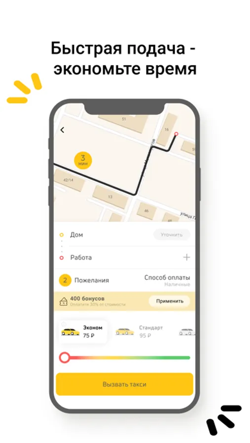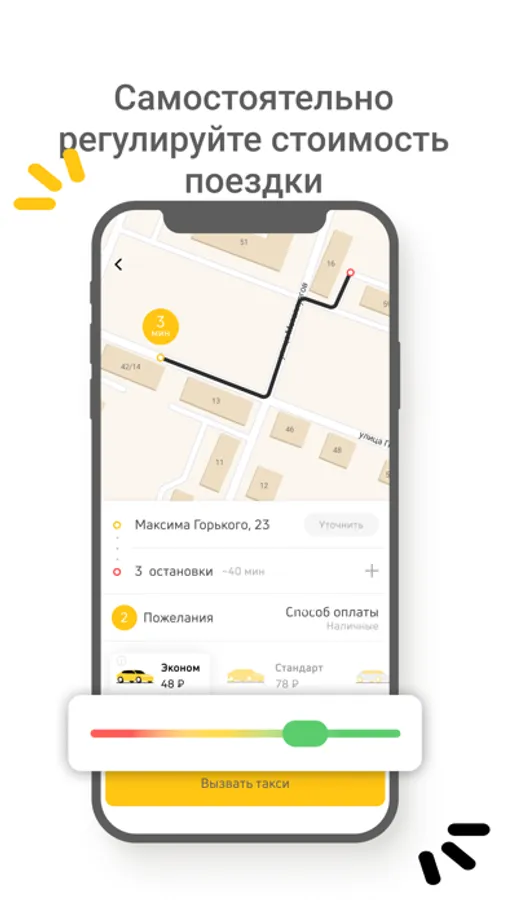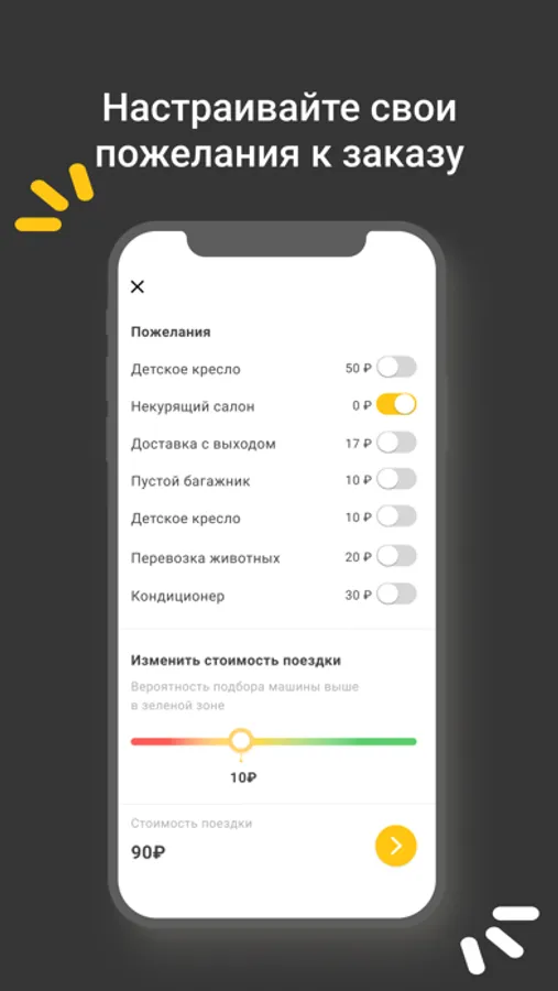 Вы заранее знаете расчетную стоимость поездки и даже можете ее увеличить, если хотите ускорить назначение машины и уехать быстрее.