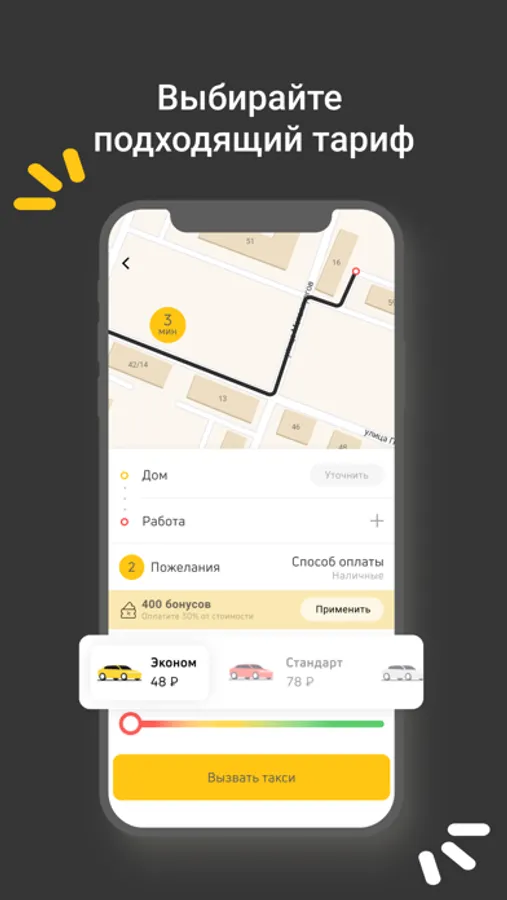 «Эконом» и «Стандарт» - такси на каждый день по разумным ценам. «Комфорт», если хотите просторный автомобиль в отличном состоянии. Выбирайте тариф «Минивэн», если едете большой компанией, везёте лыжи, велосипед или несколько чемоданов в аэропорт.