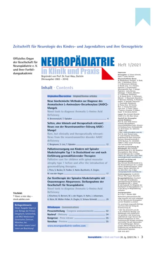 "Neuropädiatrie in Klinik und Praxis" erscheint viermal im Jahr, jeweils zu Beginn der Monate Februar, Mai, August und November. Sie wird herausgegeben von Prof. Dr. med. Ulrike Schara, Essen sowie Prof. Dr. med. Thomas Lücke, Bochum.