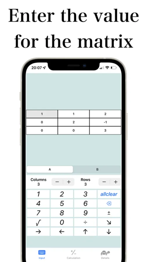 1. First, enter the matrix values A and B on the input screen. Matrix A and B can be replaced by buttons on the screen.