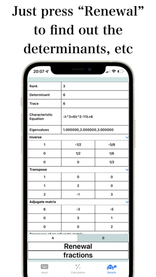 3. If you want to know the determinant, etc. From the matrix you entered, hit the details tab at the bottom of the screen and click the update button to display the output.