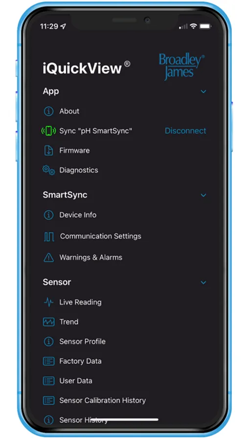 Use iQuickView® to wirelessly monitor and administer Broadley-James' smart sensors and devices. The iQuickView® application connects via Bluetooth to Broadley-James’ Smart Devices (Sync Modules and Transmitters) including the CalSync®, OptaSync®, and all versions of SmartSync®. Use the application to configure and verify settings of the Smart Devices as well as communicate [Smart Device required] with the full line of Broadley-James smart sensors via our SensorTalk™ protocol. Perform sensor calibration, adjust signal filtering, monitor sensor health indicators, and view extensive sensor history.