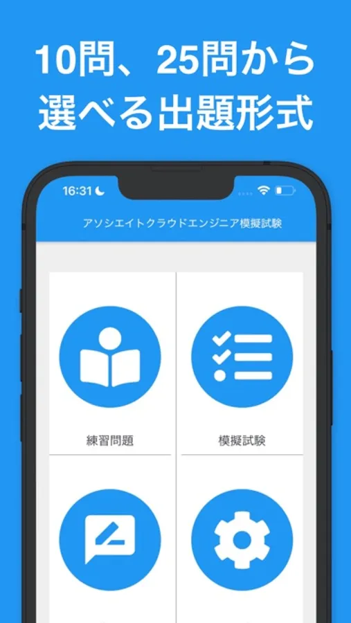 10問ごとのクラウドプラクティショナー問題に挑戦できる練習問題、CLF本番試験同様の25問を解くことができる模擬試験を搭載。